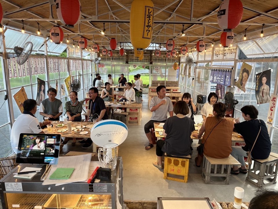 昭和ヒットメドレーが流れて、ビールケースの箱を椅子にして
