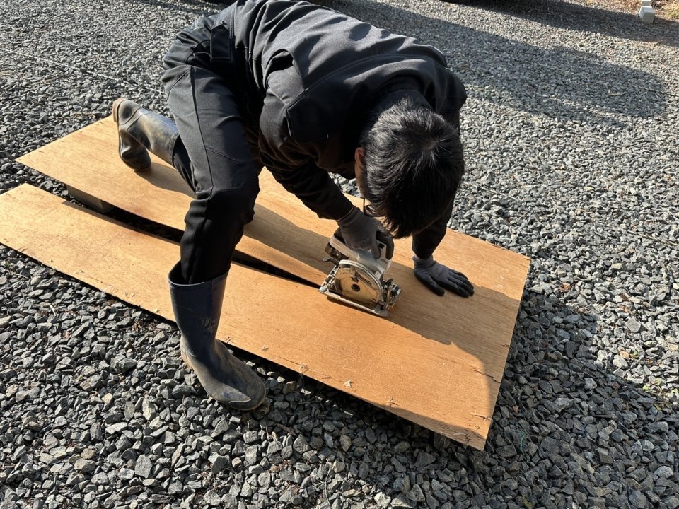 (蔵を工事している大工さんに、ベニヤ板はカッターナイフで切れることを教えてもらい仰天...勉強になりました。)